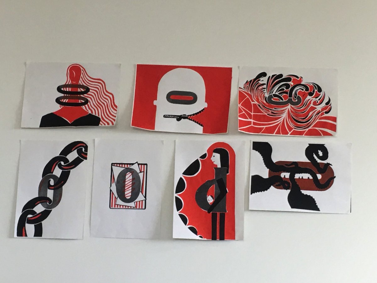 We have done illustrations about printing. We use different letters and numbers to do word associations . A simple shape is endowed with myriad new definitions in different brains . Because of carelessness, I missed the first red print, it makes me feel very remorse and regret . Recently, I haven't done everything well, but I've learned a lot from every failure . A good work should not only have good inspiration, but also need constant investigation and rigorous logic . It's simply the fact that red and black create so many wonderful works, which shows that art really needs endless learning.