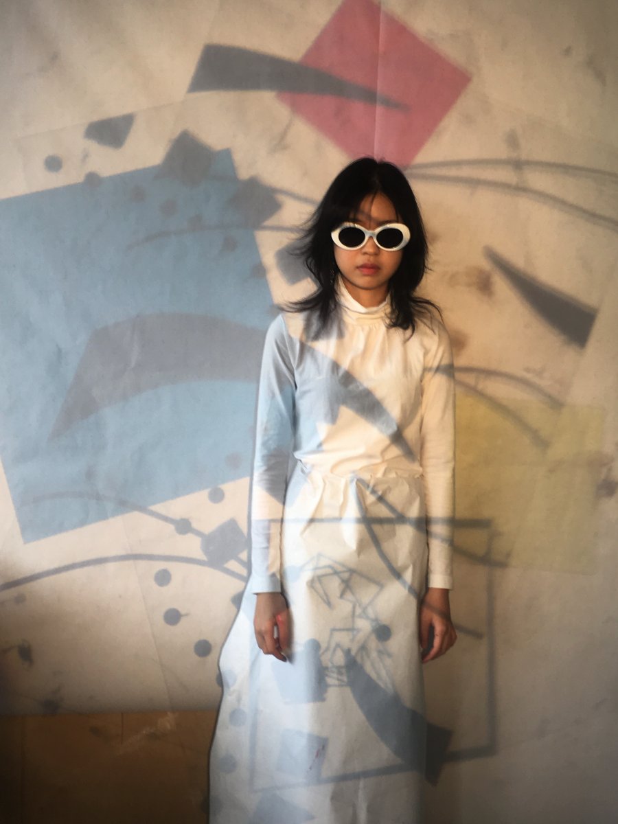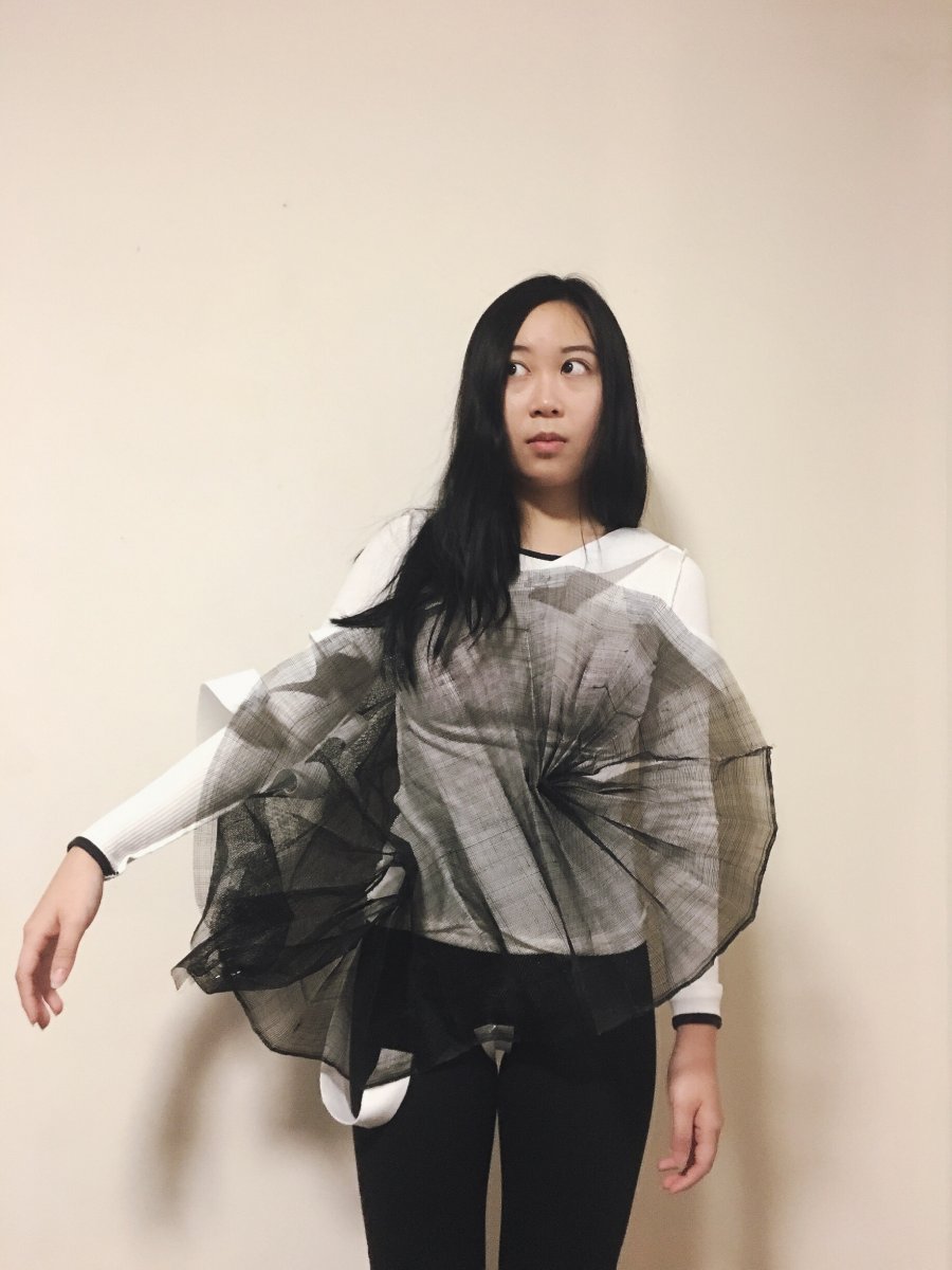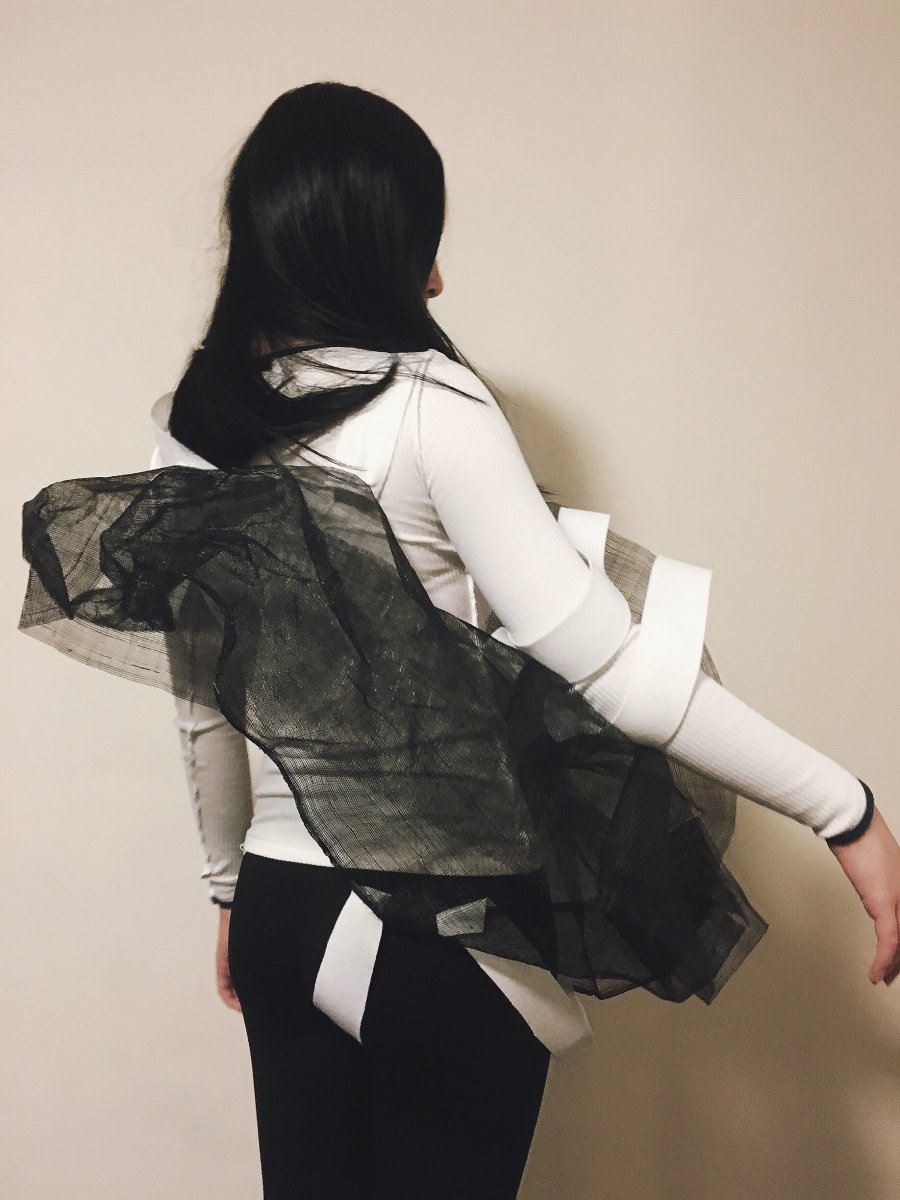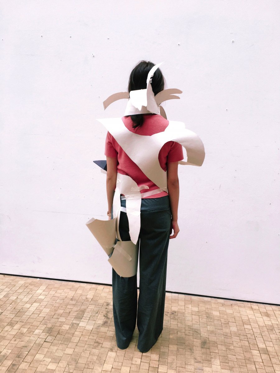 We developed the drawing sketches of first day,I tried to draw a more detailed design, and this process needs to be modified repeatedly.The paper has working on the body that arouse my prediction and imagination of the fabric .We adapt to how to think about the relationship between shape and material in the process . At the same time, working on paper is also a kind of research for us . The combination of every edges is not as single as imagined . It's possible that there's only one side that has been changed, and it's going to have a completely different shape .Paper has strong plasticity ,all kinds of style modelling can be created by paper.We use paper to make a model that can not only focus on its shape, but also observe its gaps and hollow out.In the process, I found that making clothes doesn't have to be a fixed "dress" or "coat", but rather to think more about the relationship between shape and human body.