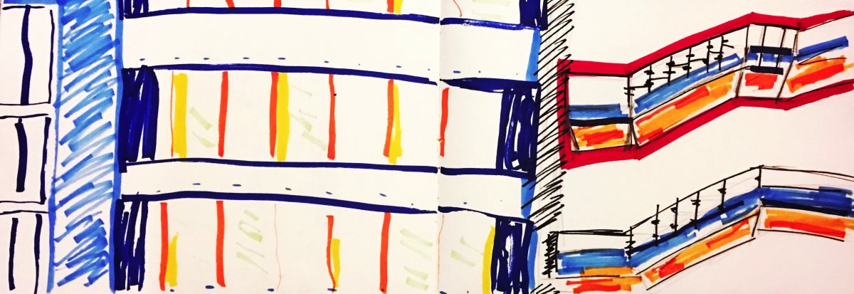 We observed a lot of buildings at Barbican centre , used different colors and lines to express those structures . I like to use contrasting colors and bright colors,Because these colors highlight people's extreme personalities and styles .This is the third time that we have extended the shape and the pattern through architecture.,These lectures have given me an update and a deeper understanding of "fashion and textiles" . Creative inspiration actually all around us . Observation is one of the most important behaviors .At the same time, I also learned to observe the details through a big category . It's also important to consider color matching , because it affects the visual effect of the final pattern .
